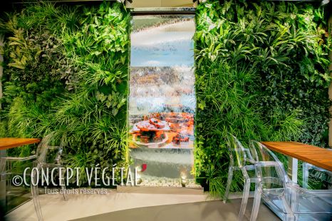 Mur en végétal artificiel dans un restaurant de renom sur la Croisette. Il est situé en extérieur, les végétaux choisis sont traités anti UV pour durer dans le temps.