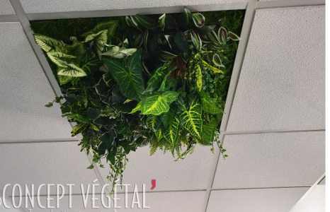 Réalisation par Concept Végétal de 3 suspensions végétales dans un restaurant de St Sauveur . Association de plantes diverses artificielles
